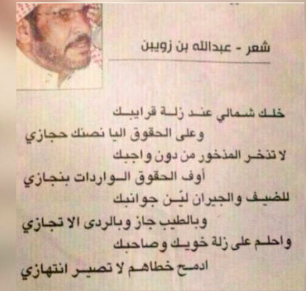خواطر شعـر On Twitter خلك شمالـي عند زلـة قرايبك وعلى الحقوق اليا نصنك حجازي للضيف والجيران لين جوانبك وبالطيب جاز وبالردى لاتجازي عبدالله ابن زويبن Abdhgsw